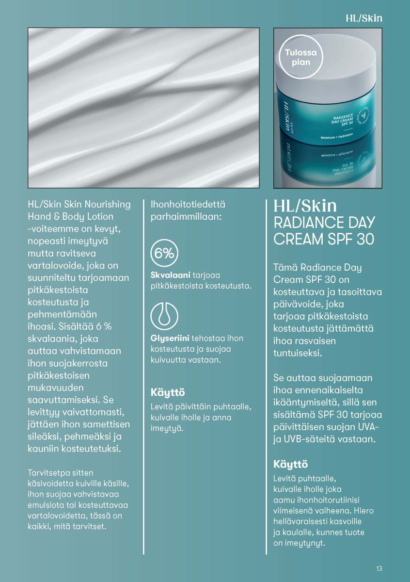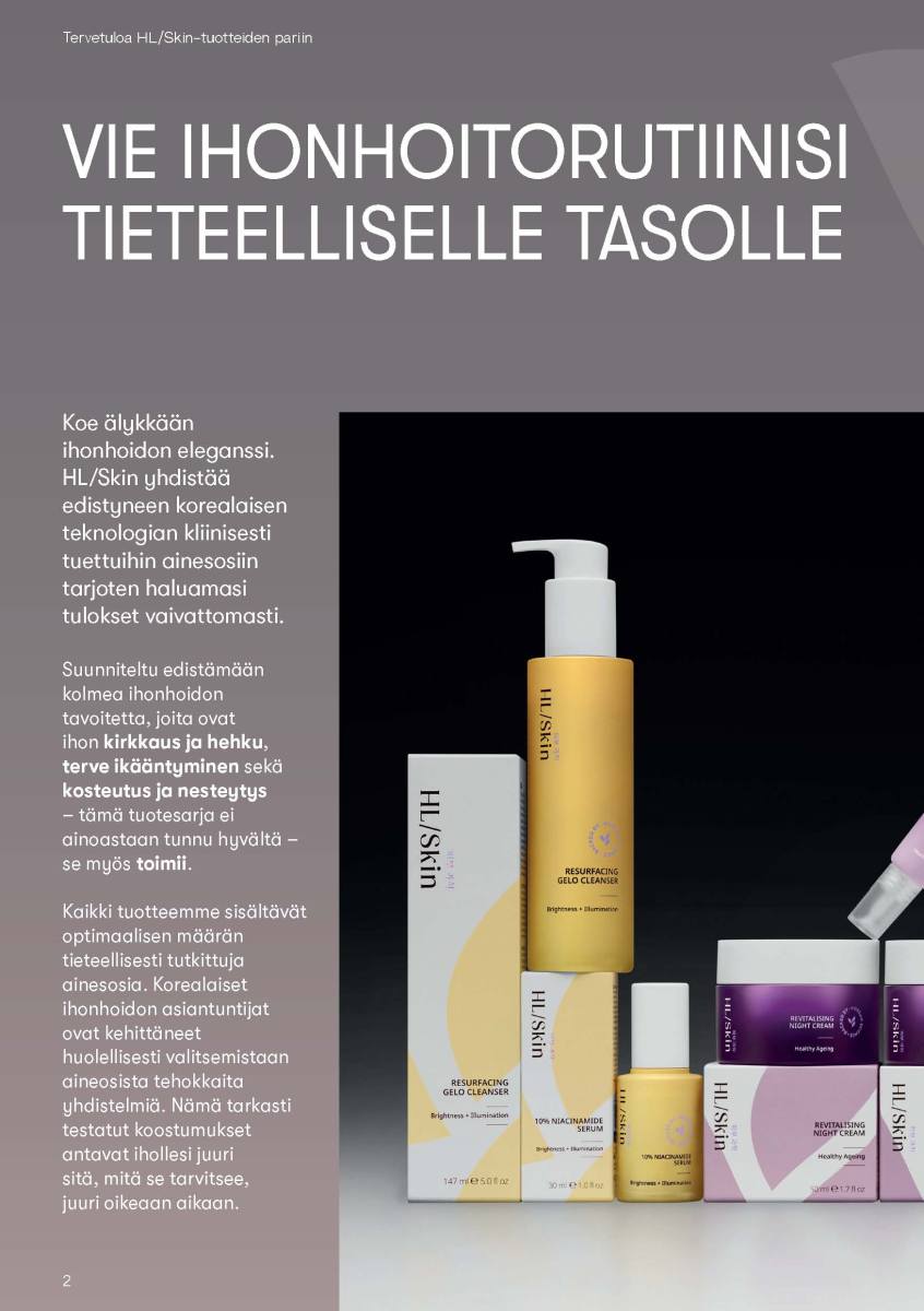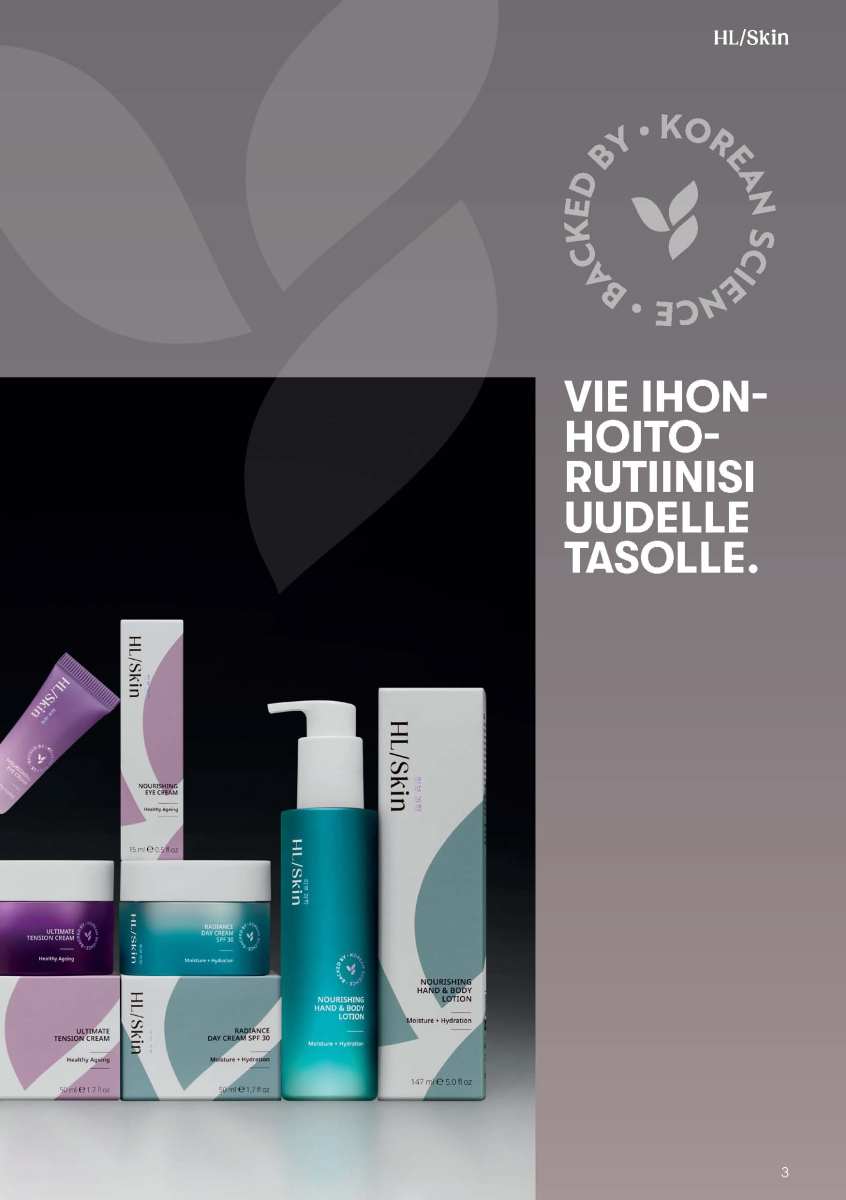 Uudessa HL/Skin sarjassa on kolme päätavoitetta, joita ovat ihon kirkkaus ja hehku, terve ikääntyminen sekä kosteutus ja nesteytys.