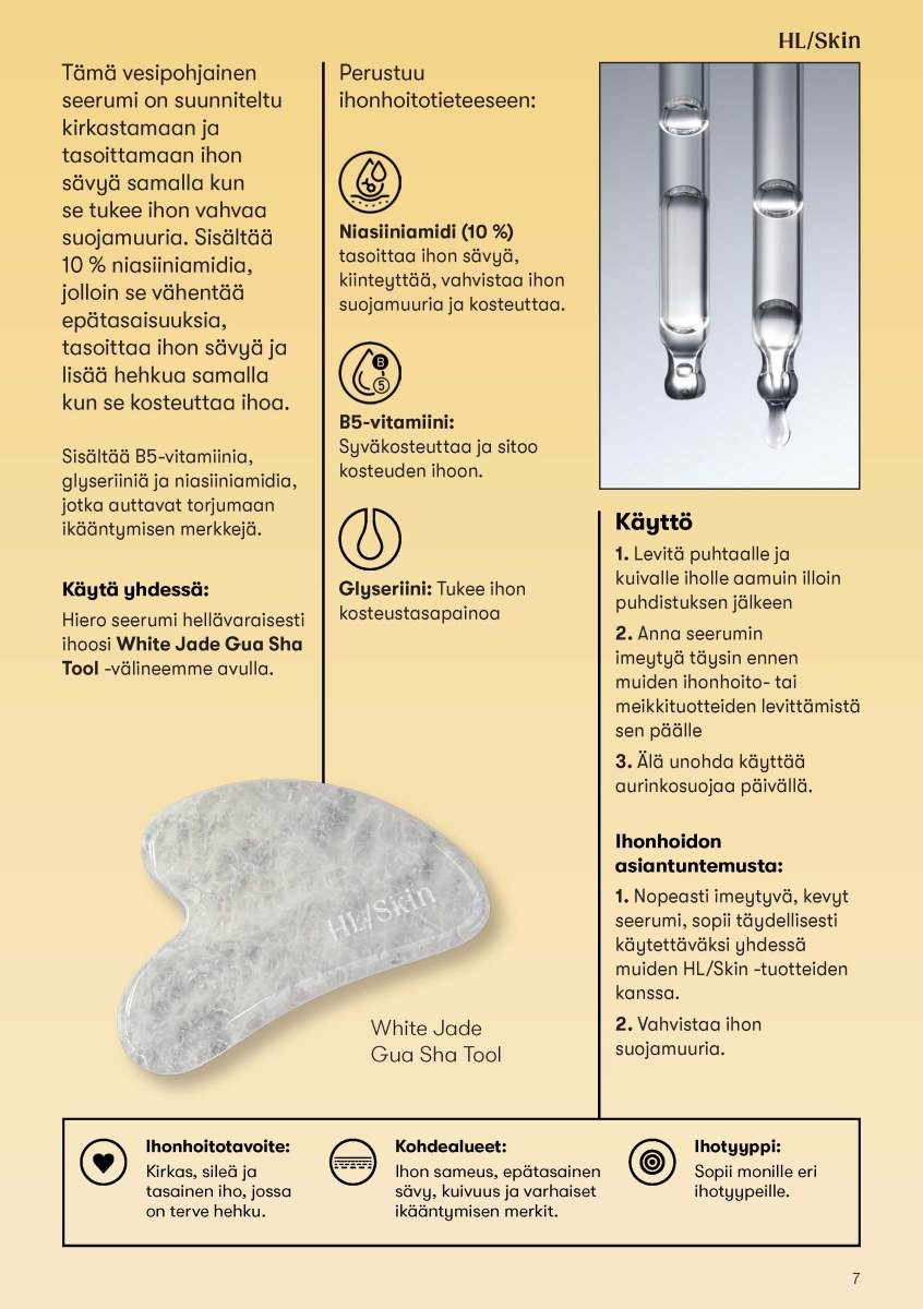 - HL/Skin 10% Niacinamide, vesipohjainen seerumi kirkastamaan ja tasoittamaan ison sävyjä